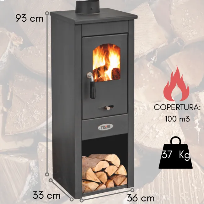 Stufa a legna completa di portalegna, compagna ideale per riscaldare e rende uniche le fredde serate invernali.
